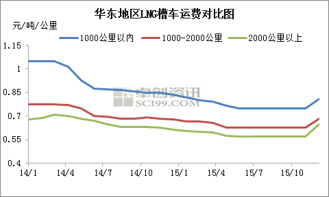 虽在2015年12月份,受天气因素影响,LNG槽车运费有所上升,但据卓创资讯数据统计来看,2015年与2014年LNG柴油车运费相比,LNG运费普遍下调0.15-0.2元/吨/公里,下调幅度在20%-25%。另外卓创从市场获悉,受LNG整体行情低迷影响,少数物流企业出现平运情况,物流企业处境困难。进入2015年以来,超过2000公里的运费长时间维持在0.57元/吨/公里,因物流运费降低导致LNG运输企业运营困难。