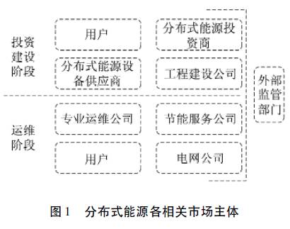 从市场角度看,各市场主体所处的市场地位不同,所具有的权责也存在差别。如,外部监管部门( 政府部门、行业协会等) 主要为分布式能源的发展提供政策保障和外部管制; 分布式能源投资商、金融机构、设备供应商、工程建设公司等主体的合理投资和规范化建设共同推动了分布式能源的快速发展; 专业运维公司、节能服务公司、用户以及电网公司间的有效协作确保了分布式能源系统的正常运营。