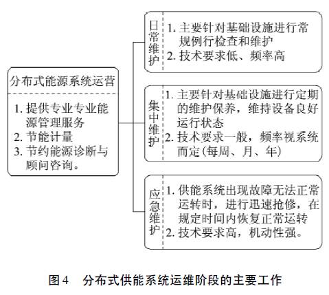 在分布式供能系统调试完毕,开启计费周期时即进入系统运维阶段。分布式能源运维是确保供能系统安全、稳定、高效运行,减少投资商经济损失的重要环节,其主要包括产能设备、供能设施、通信系统等多个设备和系统的巡检和维护管理工作,以及节能率测试、节能咨询和增值服务等工作。总的来讲,即是对整个供能网络、系统、数据库等软件和硬件进行日常维护、集中维护、应急维护,并对供能系统使用过程中业主的问题进行答疑,能及时报告、排除、处理运营故障和事故,确保安全、可靠地供能。本着“预防为主、防治结合,防止供能中断”的原则,分布式供能系统运维的主要工作内容如图4 所示。