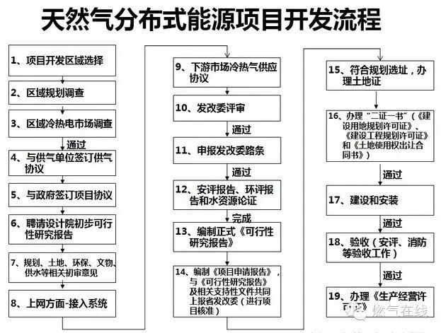 近来,天然气分布式能源发展日渐火热,项目审批和上马的新闻不断,各地方政府纷纷制定当地天然气分布式能源发展规划。更热闹的还属各类相关企业,找项目、论证项目、上项目。 那天然气分布式能源项目的开发和审批究竟是怎样的流程?今天就带大家来深入地看一下。 1、项目开发区域选择 选择地区——经济发达、能源品质要求高的城市,以及天然气供应有保障的地区; 选择对象—— 选择标准——较大冷、热、电负荷,年运行时间长(10万平米以上,冷热供应时间8-10个月)区 2、区域规划调查(以工业园区为例) 工业园区的总体发展详细规划,包括近期和远期的土地面积、人口、产业结构及空间布局,工业、公共建筑、住宅等各类占地面积和建筑面积。 工业园区近期、中、远期的能源规划,包括冷、热、电、汽终端需求负荷、及其昼夜和季节变化规律,电力规划先于冷热规划 * 如果工业园区尚未编制能源规划,可与政府相关部门协商,委托有资质的单位编制“城市集中供热规划”或“热电联产规划”,并经省级行政主管单位审批,并取得批复文件。 3、区域冷热电市场调查 -- 工业(工业园区)热负荷现状 -- 采暖热负荷现状 -- 生活热水及空调热负荷现状 -- 热电联产集中供热现状 -- 按容量统计工业园(区)内锅炉现状 -- 按燃料统计工业园(区)内锅炉现状 -- 工业园(区)内不同热源类型所占份额 -- 热网、供热和电源 、电网调查 -- 当前存在问题调查与分析(供热设施、环境状况、供热管理体制、电源设施) -- 工业园(区)热负荷、冷负荷与电负荷发展预测 4、与供气单位签订供气协议(意向书) 5、与政府签订项目协议 6、聘请设计院初步可行性研究报告 初可设计需取得的支持性文件或协议—— 土地方面: 1)、省市发改委同意开展前期工作的函 2)、省国土资源厅出具预审意见 3)、省住房和城乡建设厅出具预审意见 4)、省文物局出具预审意见 5)、省军事设施保护委员会出具预审意见 6)、中国民航管理局出具预审意见 7)、地震局出具预审意见 环境保护方面: 1)、取得省环境保护厅出具环境影响报告书的批复 2)、目标地市环境保护局出具的环境影响评价执行标准的函 3)、目标区域人民政府外排废水进入污水处理厂的函 4)、目标地市住房和城乡规划建设局出具的项目厂址周边规划控制的意见 水土保持方面: 省水利厅准予水行政许可决定书或水土保持方案报告书的审批 上网方面-接入系统: 省电力公司出具允许上网的函下场签订冷热气供应协议(意向 7、与下游市场签订冷热气供应协议(意向书)