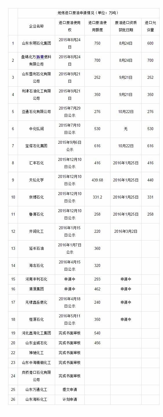 自2015年8月份开始,我国地炼炼厂纷纷进入进口原油使用的申请中,截止目前,国内地炼炼厂已有26家涉及进口原油使用,其中16家已获批,其他已获得书面审核或仍在申请中。而进口原油资质方面,目前仅11家企业获得进口原油资质。