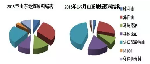 据金银岛对山东41家地炼跟踪监测数据显示,今年1-5月份,山东地炼加工原料主体非进口原油莫属,若涵盖国内贸易流通的进口原油,那山东41家地炼进口原油的使用份额将高达50%以上。同时,与前期预期稍有不同的是,海洋油及马瑞原油使用量及占比下降速度有限,这是因为国内主营单位面对进口原油份额冲击,均加大跟地炼在上下游方面的合作。除改革结算方式,加大成品油外采外,旗下进口企业或海外公司亦跟地炼在进口原油采购方面合作密切。而高额消费税及政策风险压制下,M100需求几近凋零,稀释沥青也降至冰点,当前仅玉皇盛世、齐成石化、东方华龙等地炼稍有需求。