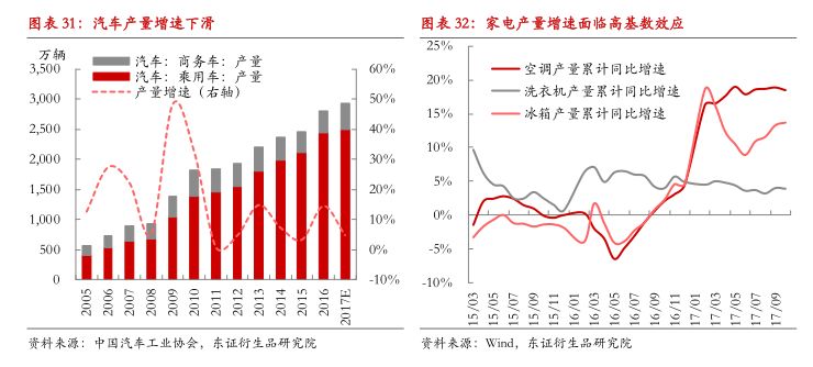 由于购置税政策导致汽车需求提前透支,2017年汽车(乘用车与商务车)产量增速降至5%以内,2018年起购置税优惠将取消,预计2018年汽车产销量增速将进一步下滑至3%附近。空调、冰箱等家电行业在2017年延续高景气,只是在高基数影响下,空调增速在2018年面临压力,但消费升级会为新型家电带来机会,包括洗碗机、空气净化器和净水器在内的新型家电正在陆续放量,由此预计共聚注塑PP需求增速下滑风险有限。长期来看,我国汽车、各类家电的保有量仍然不及发达国家水平,同时改性PP还有替代其他金属材料的空间,由此来看,改性PP在汽车、家电等领域的应用空间依然广阔。
