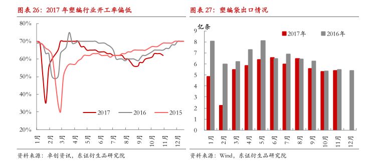 在2018年,塑编制品需求仍然面临压力,一方面房地产投资与基建投资有下滑风险;另一方面,水泥等产品的限产政策大概率会继续执行,考虑到2018年限产影响的时间包含1季度和4季度,相应产出同比有进一步萎缩风险,不过塑编制品毕竟是非耐用品用途为主,刚性需求犹存,预估2018年塑编领域的原料需求进一步小幅收缩15万吨左右。