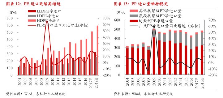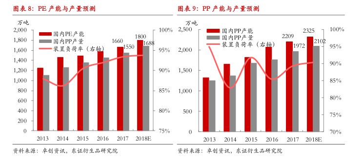 考虑到2017年投产的新装置也将带来部分增量货源,我们结合装置投产时点,预估2018年PE产量将同比增加138万吨左右,增速水平约为9%,略高于2017年7%的水平;预估2018年PP产量将同比增加130万吨左右,增速水平约为6.6%,较2017年11%的增速水平明显降低。