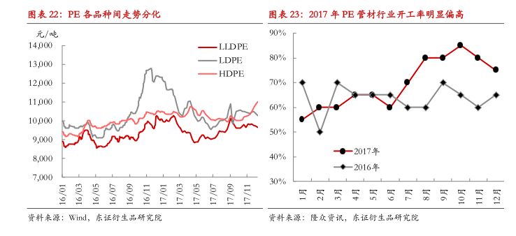 我们预计PE管材的热度可能持续,但增量恐将不及2017年,一方面海绵城市试点与综合管廊建设继续推进,按照住建部为全国海绵城市建设定下的时间表,到2020年,城市建成区20%以上面积要达标。由此,2018年相关项目的实施会继续拉动水管领域;但另一方面,煤改气项目大面积攻坚推进的高峰已过,接下来项目建设恐将难以再现如火如荼的景象,燃气配输领域PE管的需求增速有下滑风险。