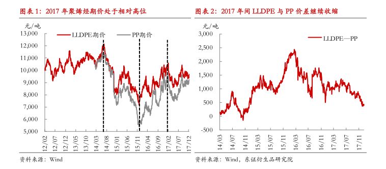 此外,LLDPE与PP价差在2017年持续收缩,由于PE与PP的产能扩张步伐并不一致,加之需求增量存在差距,从而导致PP价格走势整体强于LLDPE。