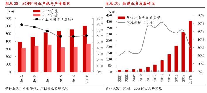 过去十年间,中国快递行业呈现爆发式增长,2011-2016年业务量平均每年实现50%以上的增长,2017年增速虽然下滑至30%,但受益于高基数效应,当前30%的增长带动的增量已经足以超过前些年50%的增长,伴随着快递行业的规模扩大,胶带等相关消费也受到拉动,接下来快递行业将进入稳定增长期,我们推断相关塑料制品的用量也基本呈现平稳增长态势。