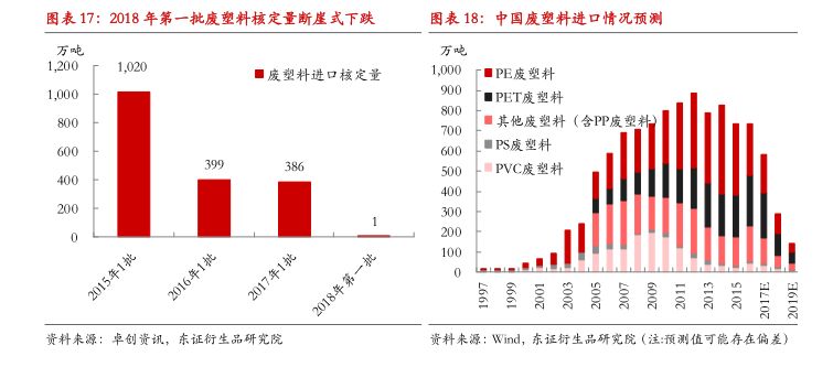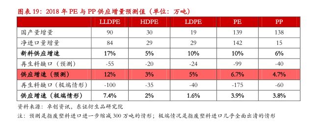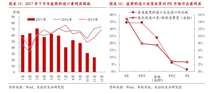 中国政府“禁止洋垃圾入境”的态度非常坚决,2018年3月起进口废塑料环保新标准将执行,而全球产业格局重构尚待时日,预计我国废塑料进口将继续缩减300万吨以上,其中1/3为PE。