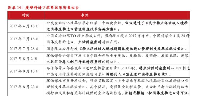 国务院发布的《禁止洋垃圾入境推进固体废物进口管理制度改革实施方案》提出了明确的时间表,第一步是规定2017年7月底前,调整进口固体废物管理目录;第二步是规定2017年年底前,禁止进口生活源废塑料等;第三步是2019年年底前,逐步停止进口国内资源可以替代的固体废物。