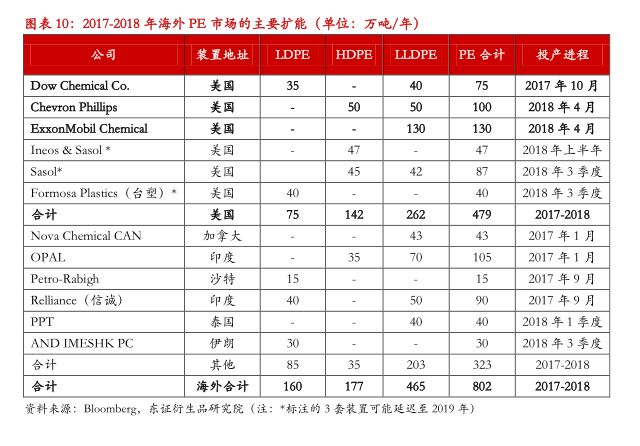 据我们不完全统计,2017-2018年间,海外PE扩能合计约为800万吨,其中2017年扩能328万吨,增速为3.7%,主要的增量来自于印度。2018年产能预计增加474万吨,同比增速将达5.1%,主要的增量则是来自于美国的乙烷裂解项目。