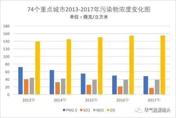 2017年,全国74个重点城市PM2.5平均浓度为48微克/立方米,相对于2013年的72微克/立方米下降33.3%;