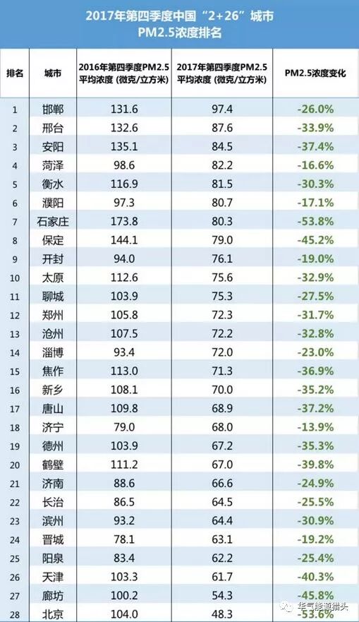 “2+26”城市在2017年第四季度的改善幅度明显,第四季度整体平均浓度同比下降达33.1%,达到了全国365城市第四季度整体改善情况(11.0%)的三倍以上,其中石家庄市和北京市PM2.5平均浓度同比改善率超过50%;廊坊市、天津市和保定市PM2.5平均浓度同比改善率超过40%。