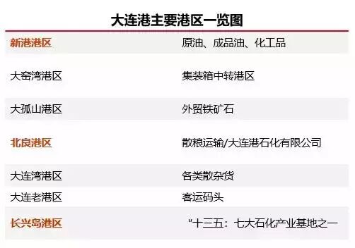 大连港目前主要有7个港区,其中油品码头位于新港港区(大连港油品码头公司),北良港区(大连港石化有限公司),长兴岛港区(长兴岛石化基地的配套项目)