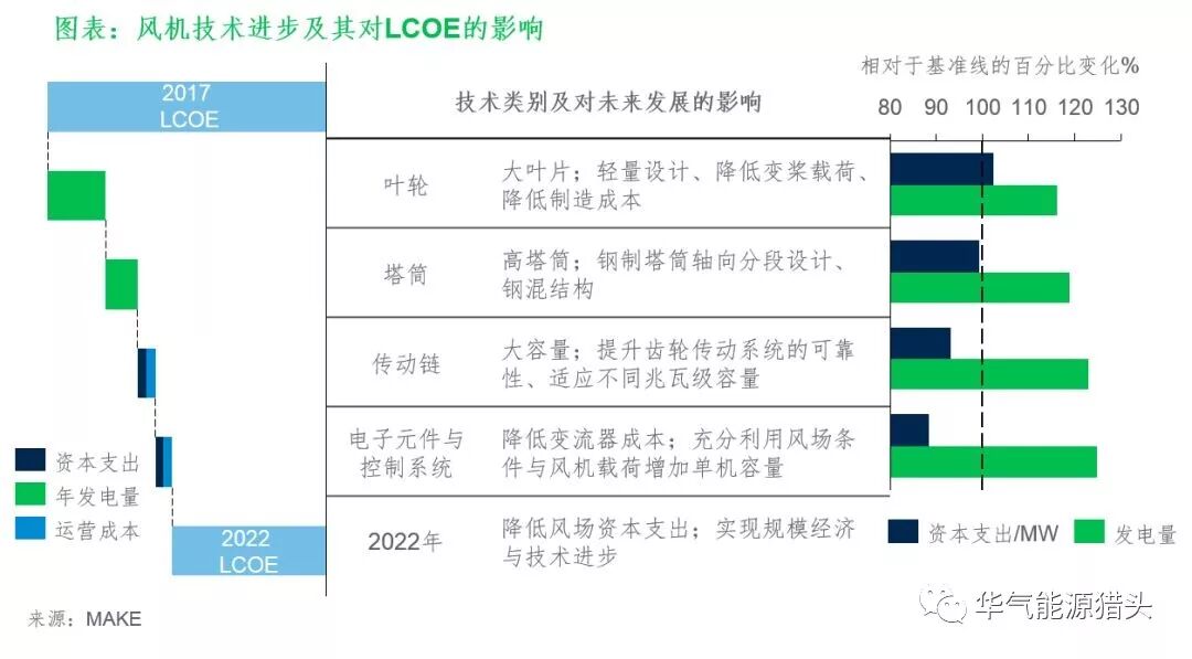 风机技术的发展是近年来风电平准化度电成本(LCOE)降低的主要原因。越来越多的大叶轮、高塔筒、大兆瓦风机正迅速进入市场。该发展趋势将持续对风电LCOE产生有利影响。风电已逐步发展成为可靠的资产类别,融资环境有所改善,更利于降低加权平均资本成本。