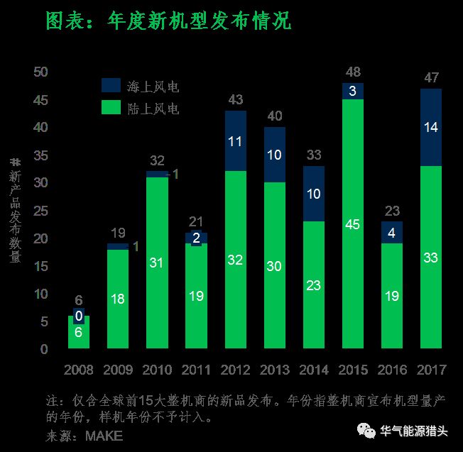 随着业内对风电LCOE的关注以及开发商对新一代大型风机的需求增长,风机整机商面临着巨大压力,比以往更频繁地推出新款风机产品。新机型的开发,或是在现有风机机型基础上通过风机增容或加大叶轮直径的方式创新,或是开发全新的风机平台。以下图表对比了2016、2017年度新机型发布情况。其中很大一部分的产品发布是针对中国市场推出的2MW低风速风机平台及初代3MW风机平台。与此同时,西方整机商也大量推出了全新的4MW机型。海上风电市场同样新增了大量风机产品,尤其是在中国市场,有望以此迎接未来海上风电市场的快速发展。