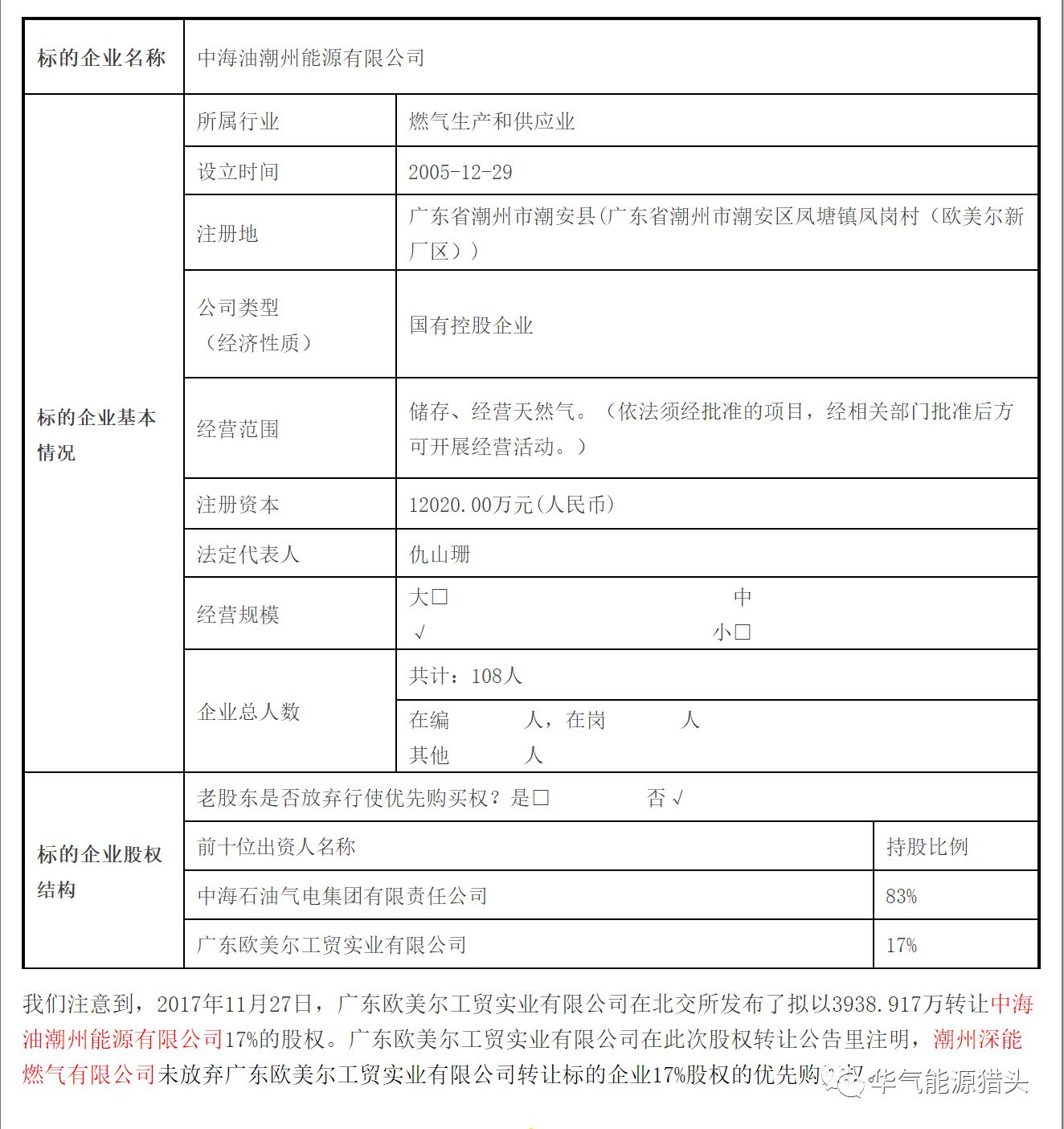 2018年1月12日,深圳能源集团股份有限公司发布公告,同意控股子公司潮州深能燃气有限公司(以下简称:潮燃公司,本公司持有51%股权)拟参与中海油潮州能源有限公司17%股权竞拍。