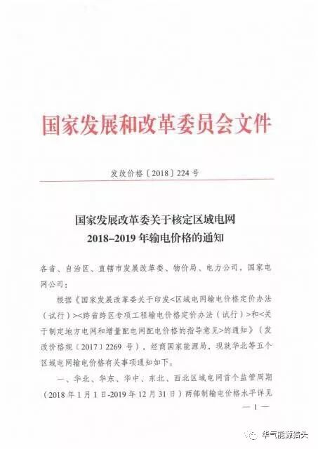 《关于核定区域电网2018—2019年输电价格的通知》(发改价格[2018]224号):