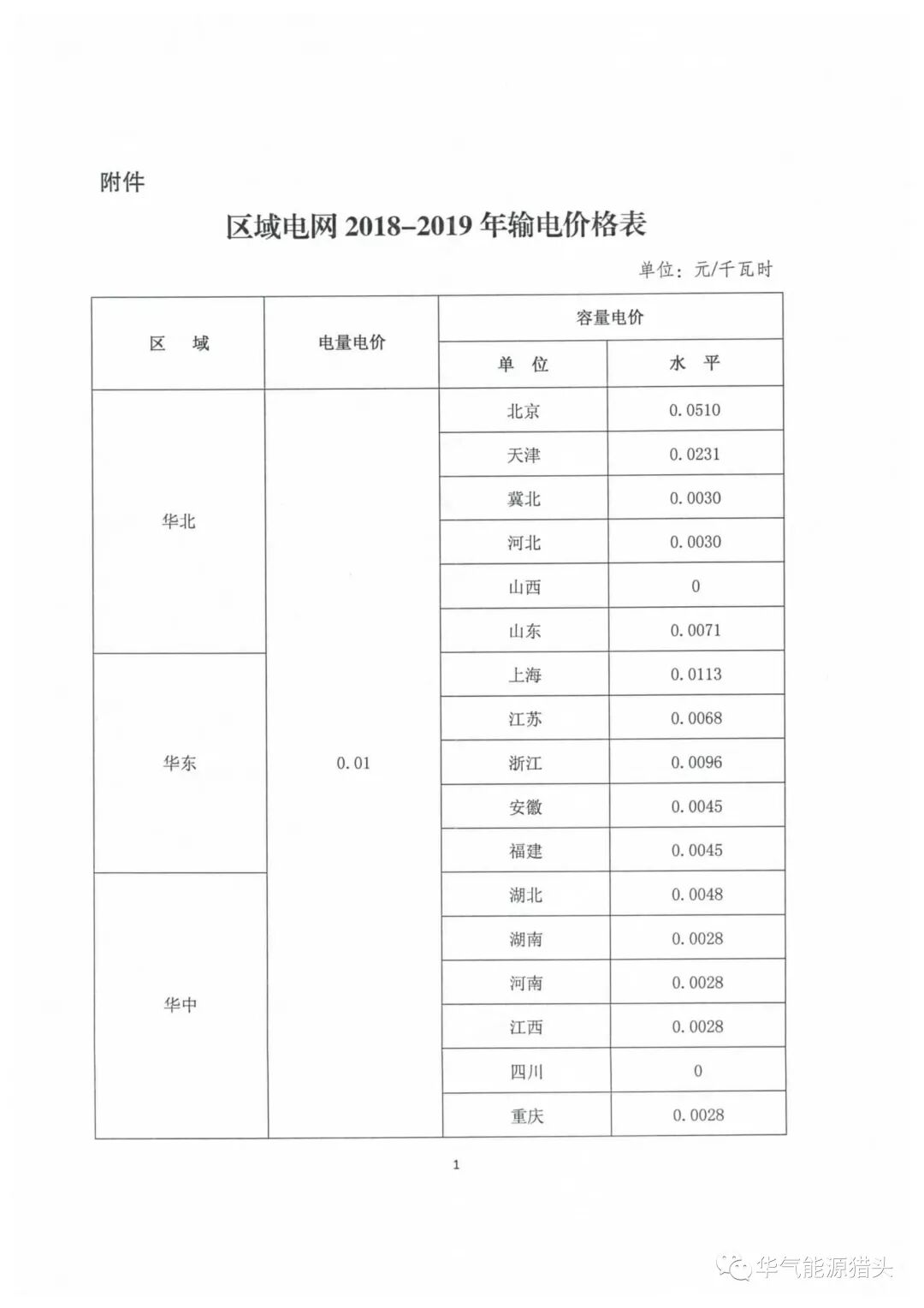 国家发改委近日印发了《关于核定区域电网2018-2019年输电价格的通知》(以下简称“通知”)。“通知”规定了华北、华东、华中、东北和西北区域电网首个监管周期(2018 年1 月1 日-2019 年12 月31 日)两部制输电价格水平,其中:电量电价随区域电网实际交易结算电量收取,由购电方承担;容量电价随各省级电网终端销售电量(含市场化交易电量)收取。