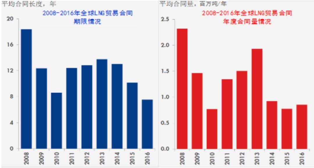 LNG购销合同由从前的长期(20年及以上)、固定目的地转向“更短”、“更小”化发展(合同期限越来越短、年度合同量越来越小);