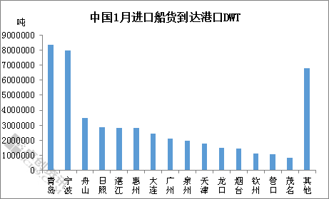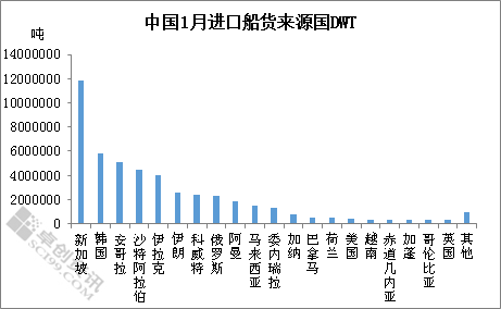 1月份中国进口船货中,近1/4来自新加坡,韩国以12%的占比位居次席。非洲、中东和俄罗斯船货紧随其后。由此可见,中国进口船货中有近3成来自于新加坡、韩国等中转港口。虽然俄罗斯是中国最大原油进口国,但只有东部两个港口向中国出口原油船货,因此1月份来自俄罗斯的船货量仅有约230万吨。