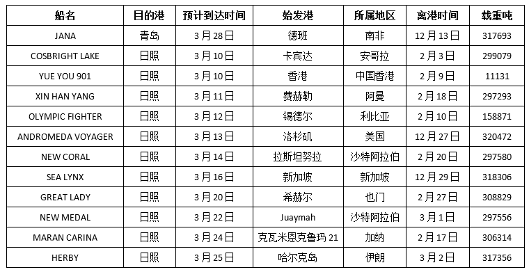 据船期在线最新数据显示,截至3月底,山东主要港口预计有28船进口船货抵达,合计载重吨706万吨。其中东营港2船合计约10万吨;青岛港15船合计403万吨;日照港11船合计293万吨。