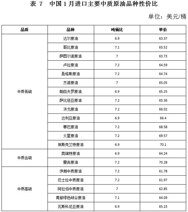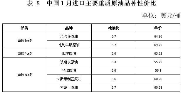重质原油中,中国企业更倾向于进口委内瑞拉的波斯坎和马瑞原油,1月份委内瑞拉原油进口均价约为56美元/桶。而澳大利亚的比利牛斯原油进口成本在重质原油中最高,进口均价接近70美元/桶,在1月份所有进口原油品种中价格也居于前列。具体原油品种价格对比见下表: