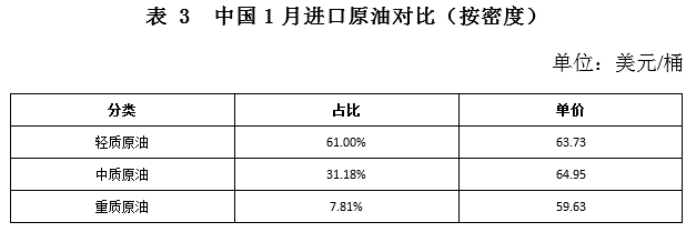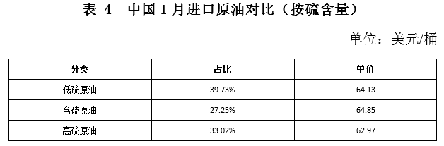 1月份中国进口原油共计来自37个国家近90个原油品种,总体来看,中国进口原油以轻质原油为主,其占比高达61%。而按照酸值来看,当月进口原油含硫量分布较为平均,但高硫原油占比相对偏高。从进口价格情况来看,整体符合品质分布,重质和高硫原油价格相对较低。具体如下表所示: