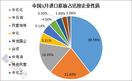 1月份中国进口原油中,中石化进口总量占比接近40%,是国内进口原油的主体,中石油进口占比近22%位居次席。两大集团1月份进口原油总量约2900万吨,合计占比达到61.18%。除两大集团外,中化、中海油和中化工合计进口总量近510万吨,合计占比10.68%,其他国企进口量占比5.14%。