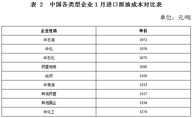 从原油进口单价来看,1月份各类型企业进口原油成本区间为2972-3274元/吨。其中,中石油和中化集团进口原油成本相对较低,均价控制在每吨3000元以内;民营地炼企业的进口成本居中,为3090元/吨;而中海油和中化工进口原油成本则相对偏高,均价高于每吨3100元/吨。具体如下表所示: