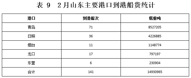 2月份山东主要港口合计有141船次进口船货,合计载重吨为1493万吨。其中,青岛港依然是山东进口原油的主要港口,共计71船次合计853万载重吨;其次为日照港,共计36船次合计423万载重吨。除此之外,烟台港、龙口港和东营港共有34船进口船货到港,合计载重吨约218万吨。