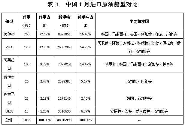 1月份逾千艘进口油轮中,灵便型油轮数量760艘次,占比高达72%,其次为VLCC占比12%。但从运量来看,虽然灵便型数量占优,但载重吨对比中,VLCC以12%的数量进口近55%的船货量。相比之下,超7成的灵便型油轮仅输送16%的船货量。