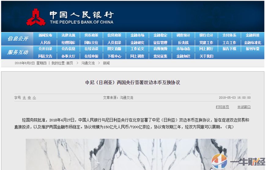据中国央行官网5月3日报道,经国.务院批准,2018年4月27日,中国人民银行与尼日利亚央行在北京签署了中尼(日利亚)双边本币互换协议,旨在促进双边贸易和直接投资,以及维护两国金融市场稳定。协议规模为150亿元人民币/7200亿奈拉,协议有效期三年,经双方同意可以展期。详情如下图所示: