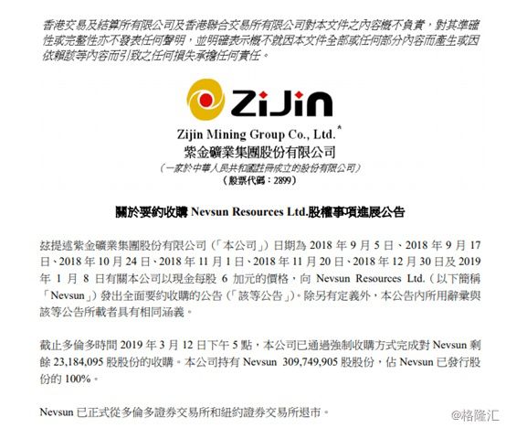 截至多伦多时间3月12日下午5点,公司已通过强制收购方式完成对Nevsun剩余2318.4万股份的收购。公司持有Nevsun3.1亿股股份,占Nevsun已发行股份的100%。Nevsun已正式从多伦多证券交易所和纽约证券交易所退市。