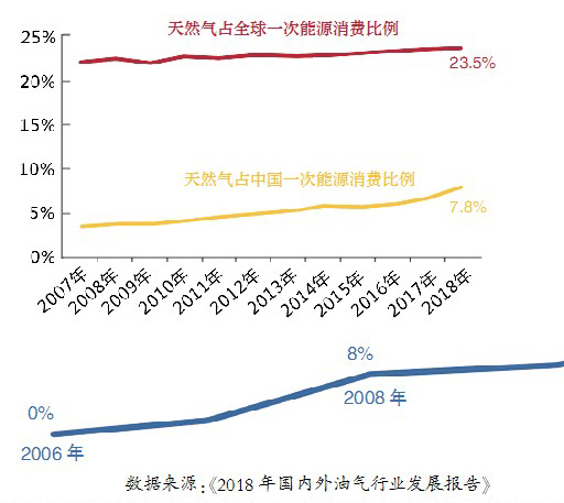 从能源转型的角度来看,天然气消费量快速攀跃是能源结构调整的必然结果。我国天然气发展起步较晚,尽管天然气在我国一次能源的消费比例已从2006年的2.5%上升至2018年的7.8%,但这个数字仍然达不到全球天然气消费平均水平的1/2,人均用气量仅为国际水平的1/3。业内专家表示,我国天然气消费水平仍在全球平均线以下。