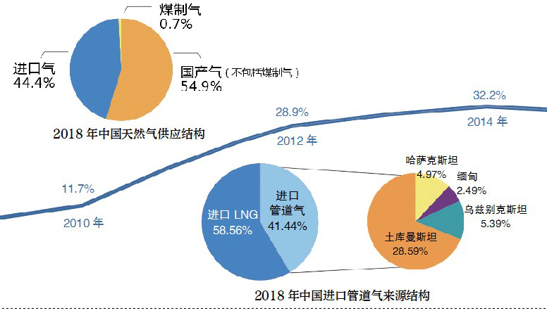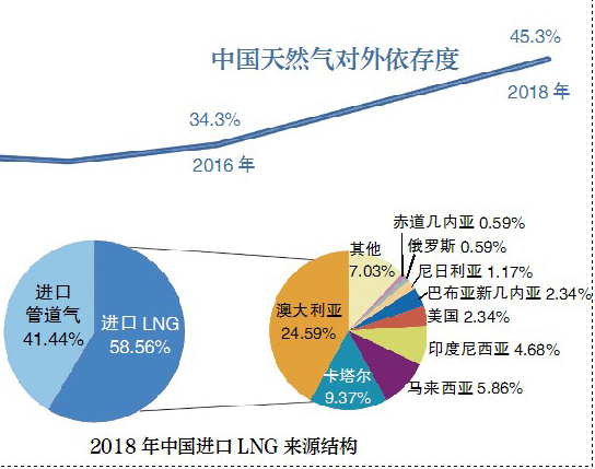 根据海关总署公布的数据,2018年中国天然气进口量比上年增长31.9%,创历史新高。根据《2018年国内外油气行业发展报告》分析,受需求拉动,2018年我国首次超过日本成为全球第一大天然气进口国,天然气对外依存度达到45.3%。