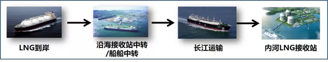 考虑到经济性和适航条件问题,理论上的运输模式是远洋大型LNG运输船将进口LNG接卸至沿海LNG接收站,再通过沿海接收站将LNG中转给内河小型LNG运输船,最后送至对应内河码头。