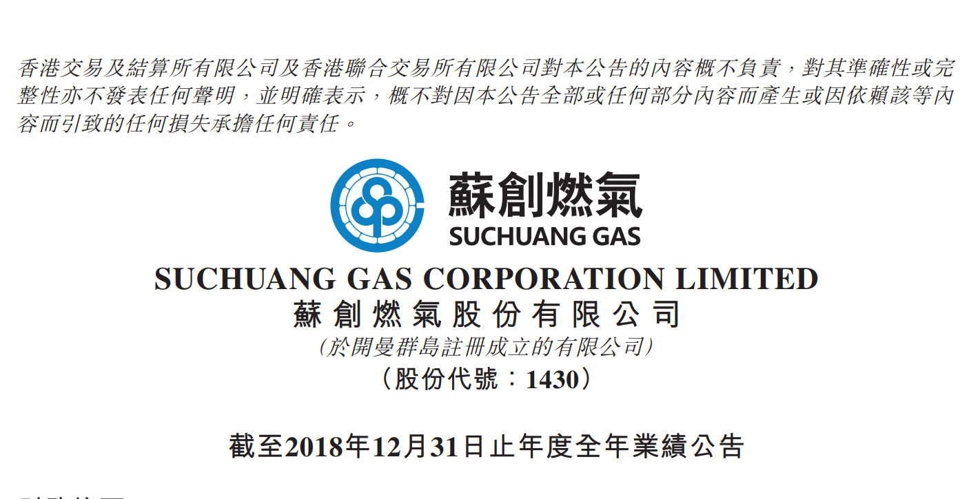 原标题:苏创燃气(01430.HK)18年度纯利增加约5.0%至9862.1万元 末期息每股0.028元