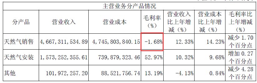 在此高速发展的背景下,重庆燃气归属于上市公司股东的扣除非经常性损益的净利润却逆市下滑11.87%,更加离谱的是天然气销售毛利率为-1.68%,同比减少1.70个百分点,年报称这主要系由于报告期内天然气上游价格上浮,而终端销气价格未能同步、足额顺调所致。