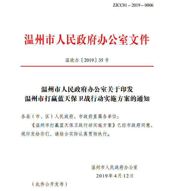 *温州市人民政府办公室关于印发温州市打赢蓝天保卫战行动实施方案的通知