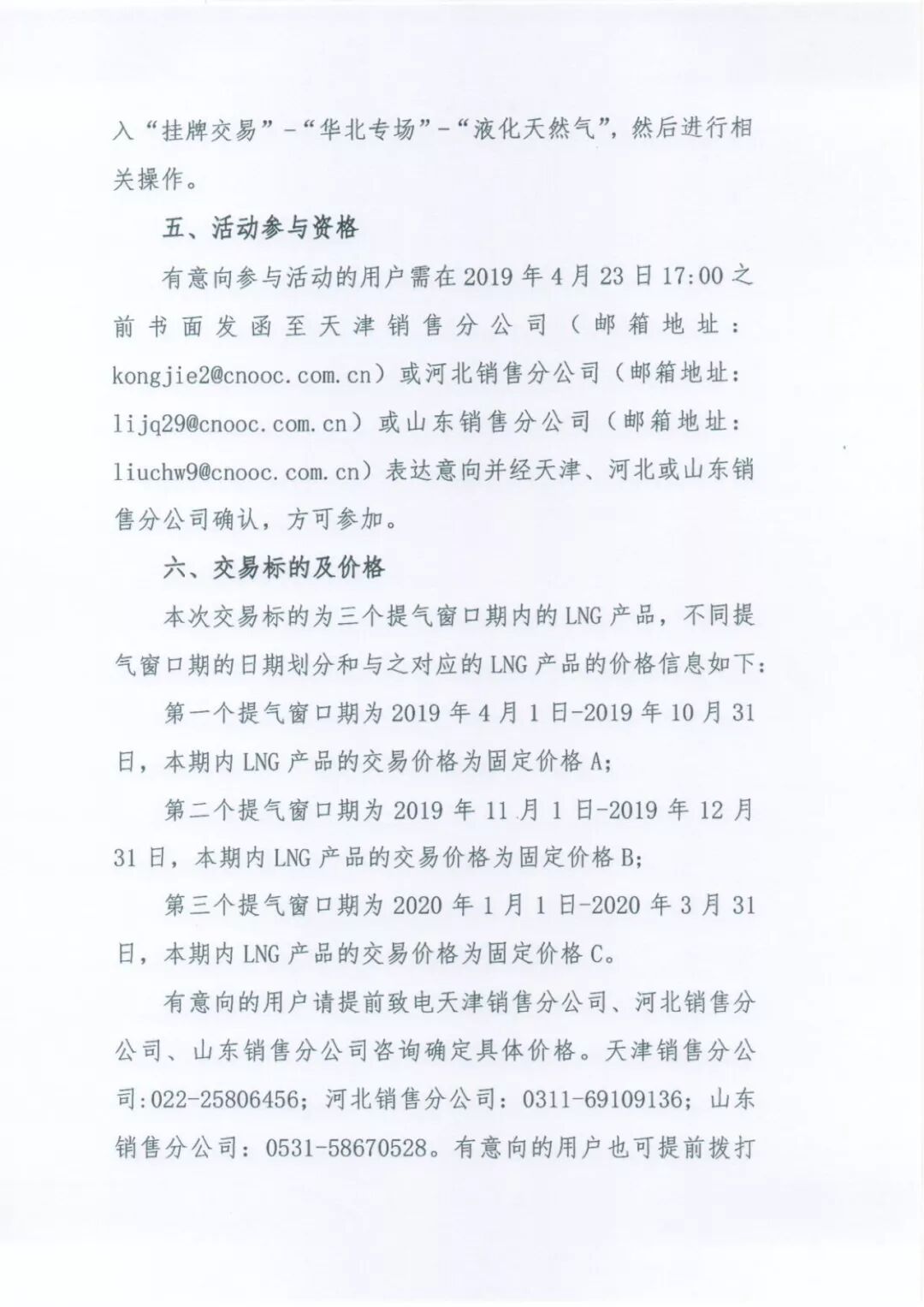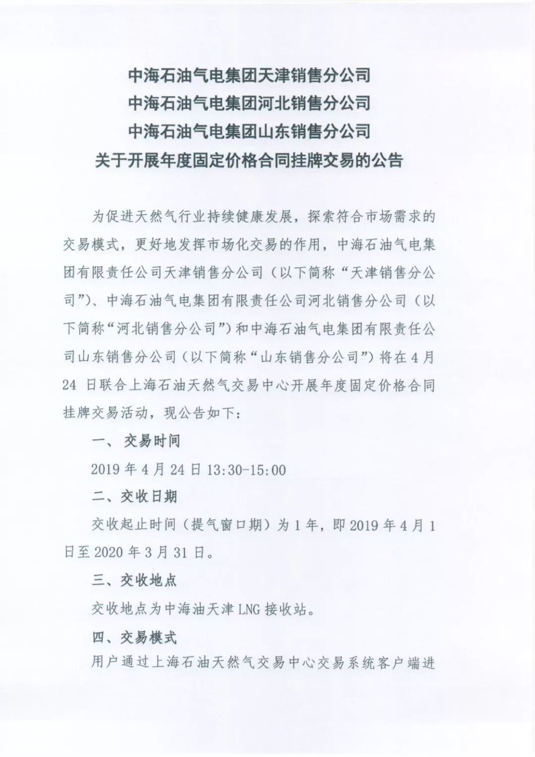 为促进天然气行业持续健康发展,探索符合市场需求的交易模式,更好地发挥市场化交易的作用,中海油气电集团天津、河北、山东销售分公司将在4月24日联合上海石油天然气交易中心开展年度固定价格合同挂牌交易。