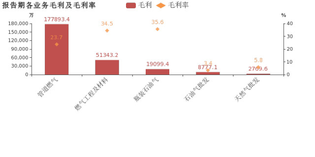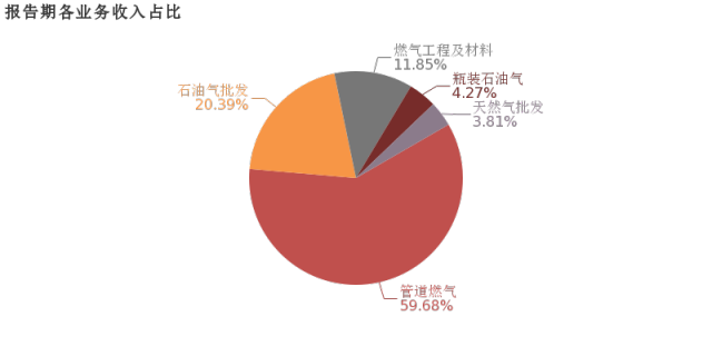 从业务结构来看,“管道燃气”、“石油气批发”是企业营业收入的主要来源。具体而言, “管道燃气”营业收入为74.9亿,营收占比为59.7%。“石油气批发”营业收入为25.6亿,营收占比为20.4%。“燃气工程及材料”营业收入为14.9亿,营收占比为11.9%。