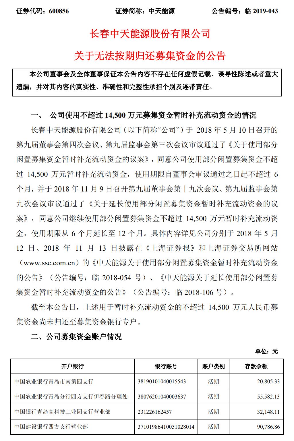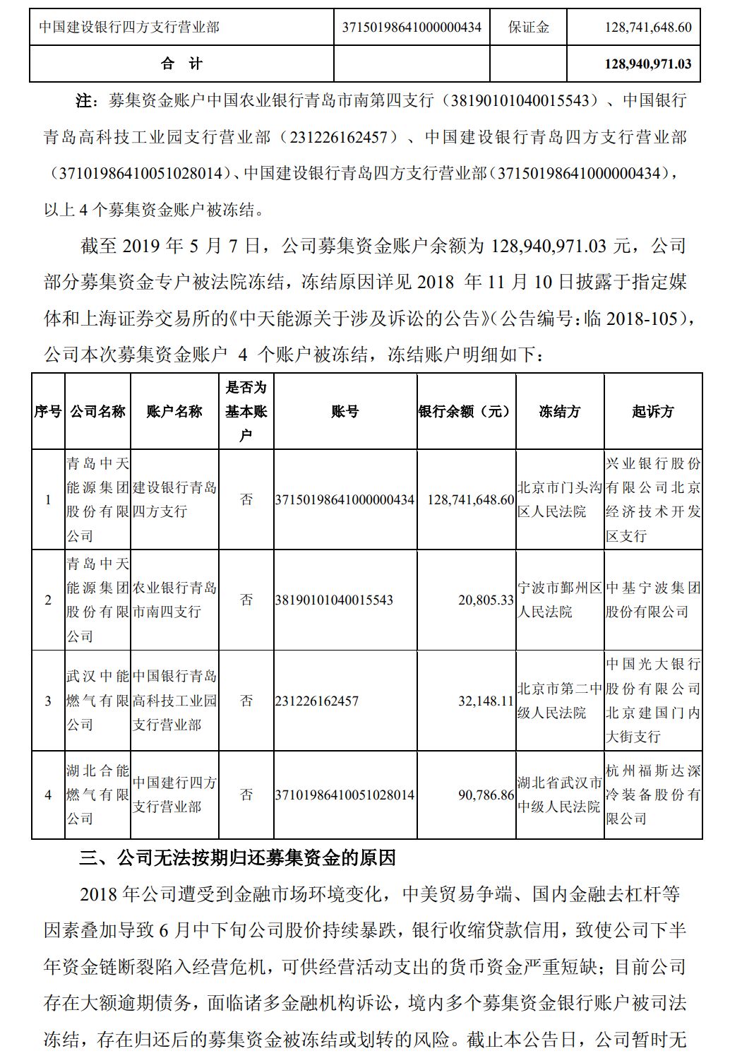 对于无法按期归还募集资金的原因,中天能源称,2018年公司遭受到金融市场环境变化等因素叠加导致6月中下旬公司股价持续暴跌,银行收缩贷款信用,致使公司下半年资金链断裂陷入经营危机,可供经营活动支出的货币资金严重短缺;目前公司存在大额逾期债务,面临诸多金融机构诉讼,境内多个募集资金银行账户被司法冻结,存在归还后的募集资金被冻结或划转的风险。截至公告日,公司暂时无法将上述用于暂时补充流动资金的不超过1.45亿元募集资金归还至公司募集资金银行专户。