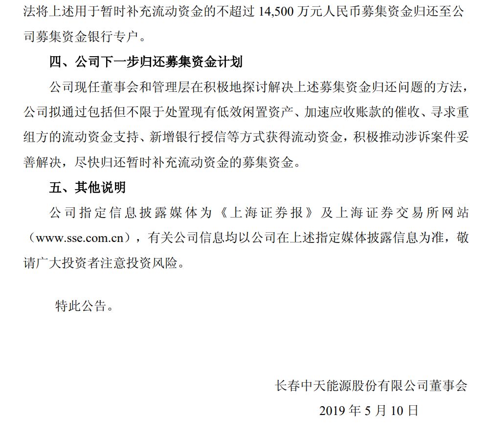 中天能源表示,公司拟通过包括但不限于处置现有低效闲置资产、加速应收账款的催收、寻求重组方的流动资金支持、新增银行授信等方式获得流动资金,积极推动涉诉案件妥善解决,尽快归还暂时补充流动资金的募集资金。