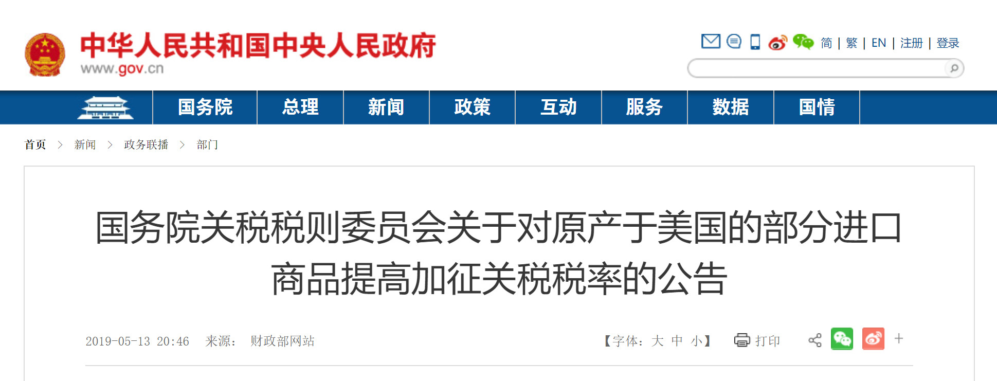 2019年5月9日,美国政府宣布,自2019年5月10日起,对从中国进口的2000亿美元清单商品加征的关税税率由10%提高到25%。美方上述措施导致中美经贸摩擦升级,违背中美双方关于通过磋商解决贸易分歧的共识,损害双方利益,不符合国际社会的普遍期待。