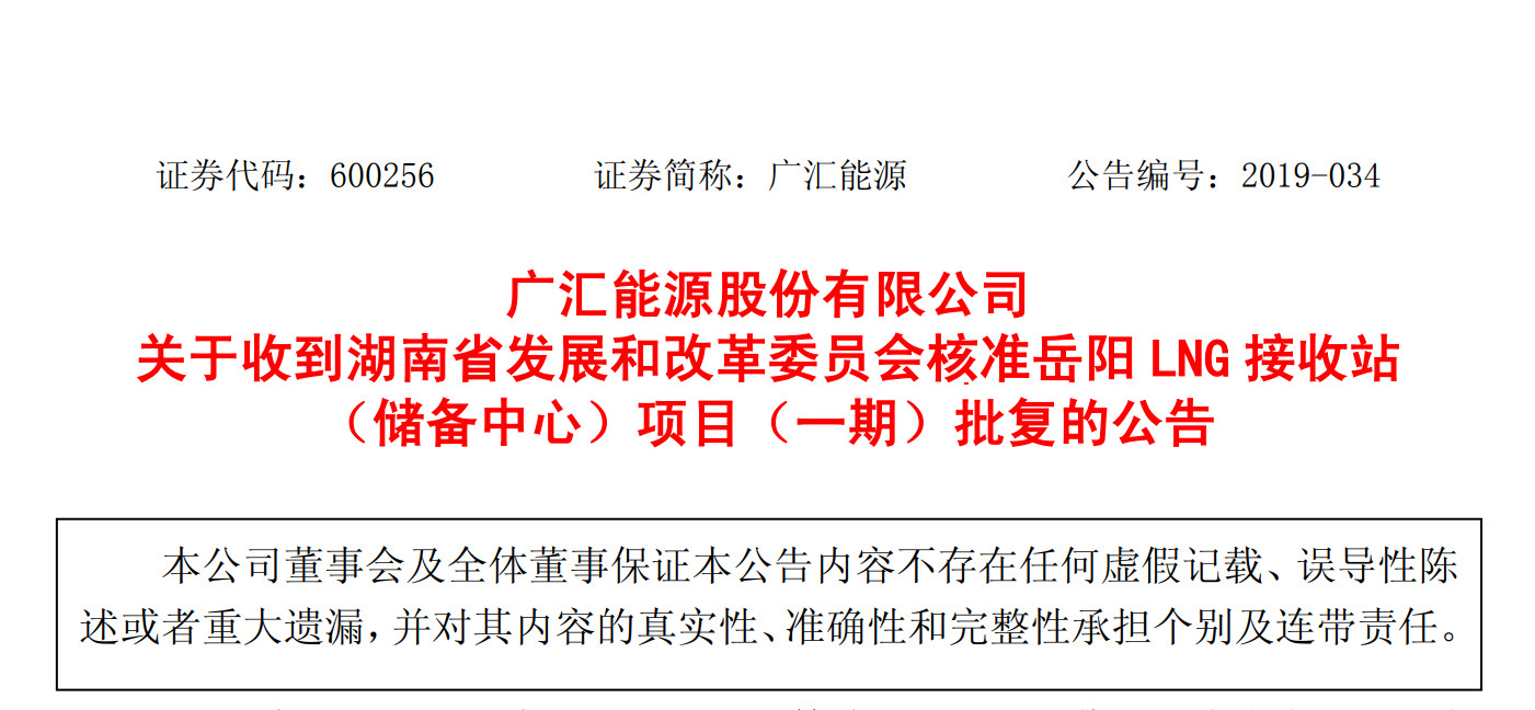 委员会出具的《湖南省发展和改革委员会关于核准岳阳LNG接收站(储备中心)项目(一期)的批复》(湘发改能源〔2019〕321 号)文件。现将批复核准事项主要内容公告如下: