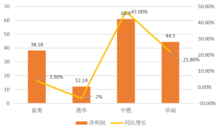 从净利润来看,中国燃气依靠华北乡镇气代煤取得了47%的净利润增速,净利润达到60.9亿港元,其次则是华润44.5亿港元,增幅也比较高达到21.8%。
