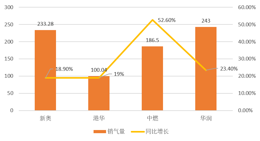 从销气量来看,四家城燃集团销气量增速均超过2018年全国天然气表观消费增速。