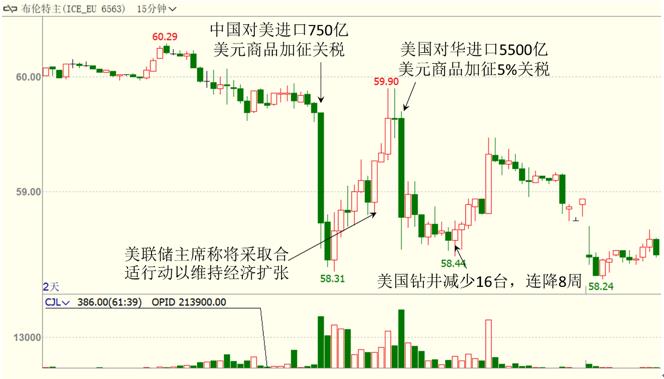 北京时间8月23日20点,中国关税委员会发布公告称,针对美国在8月15日对华进口的3000亿美元商品分两批自2019年9月1日、12月15日起加征关税的措施,中方被迫采取反制措施,经国务院批准,国务院关税税则委员会决定,对原产于美国的5078个税目、约750亿美元商品,加征10%、5%不等关税,分两批自2019年9月1日12时01分、12月15日12时01分起实施。受此影响,油价遭到抛售,布油从60美元/桶附近快速下跌至58.3美元/桶。