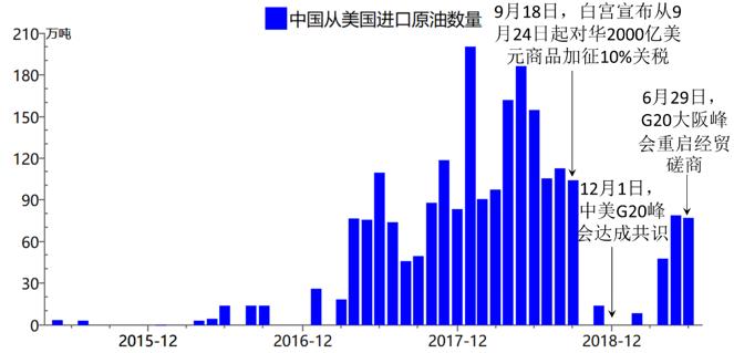 从2017年起,中国超过美国成为全球第一大原油进口国,2018年中国进口石油高达4亿吨,对外依存度接近70%。从2017年起,中国从美国进口的原油数量持续增长,最高时2018年1月单月进口超过200万吨。然而在2018年9月,美国宣布对从中国进口的2000亿美元商品加征关税后,中美关系进入冰封期,连续数月中国从美国几乎未进口原油。直到2018年12月阿根廷G20峰会之后,中美双方领导人达成共识,中美贸易谈判重启。尽管2019年中美贸易摩擦不断,但中国一直未将原油纳入加征关税的商品之中,2019年二季度中国自美国进口的原油数量大幅反弹至70万吨/月,接近2017年的月均进口数量。